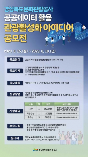 경북문화관광공사(사장 김성조, 이하 공사)는 데이터기반 관광산업의 디지털전환을 위한 ‘공공데이터 활용 관광활성화 아이디어 공모전’을 실시한다고 14일 밝혔다.