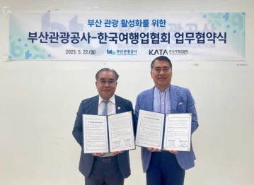 한국여행업협회(회장 오창희, 이하 KATA)는 부산관광공사(사장 이정실, 이하 BTO)는 지난 5월 22일 부산관광공사 대회의실에서 부산관광공사와 부산관광 활성화를 위한 공동마케팅 등 양 기관의 협력 체계를 구축하기 위한 업무협약을 체결하였다.