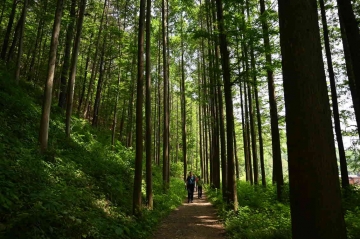 오르고 내려오는 시간은 중간 중간 두세 번 쉬며 걸어도 2시간이면 충분하다. 오를 땐 약간 힘들지만 내리막길에 접어들면 발걸음이 사뿐해진다. 첫 길목은 하늘높이 솟은 메타세쿼이아로 가득하다. 산 중턱에 이르면 소나무가 울창하고 내리막길에는 참나무와 밤나무, 편백나무가 기다린다.