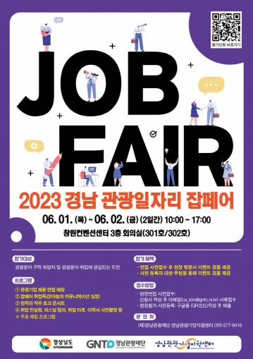경남도는 경남관광재단과 함께 오는 6월 1일부터 2일까지 ‘2023년 경남 관광일자리 잡페어’를 창원컨벤션센터 301·302호에서 개최한다고 밝혔다.