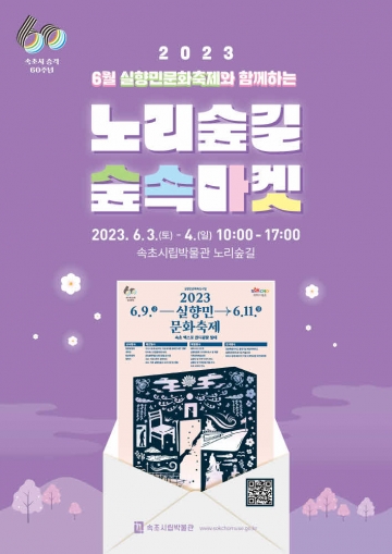 속초시립박물관은 노리숲길 숲 속 마켓 상반기 마지막 회차인 6월 실향민문화축제와 함께하는 「노리숲길 숲 속 마켓」을 6월 3일(토)과 4일(일) 양일에 걸쳐 개최한다.
