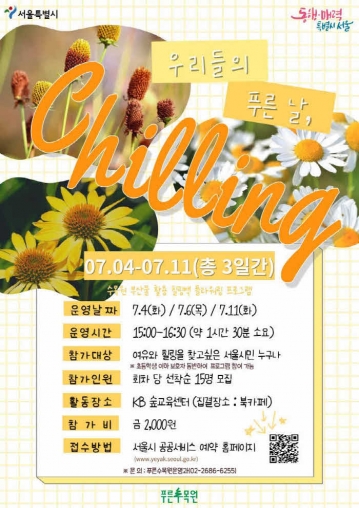 ‘우리들의 푸른날, Chilling’ 프로그램은 7월 4일(화), 6일(목), 11일(화) 총 3회 운영하며 15시부터 1시간 30분간 회당 선착순 15명을 대상으로 진행한다.