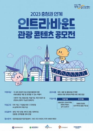 대전관광공사(사장 윤성국)는‘2023 충청권 연계 인트라바운드 관광 콘텐츠 공모전’을 통해 총 5개의 관광콘텐츠를 최종 선정했다고 5일 밝혔다.
