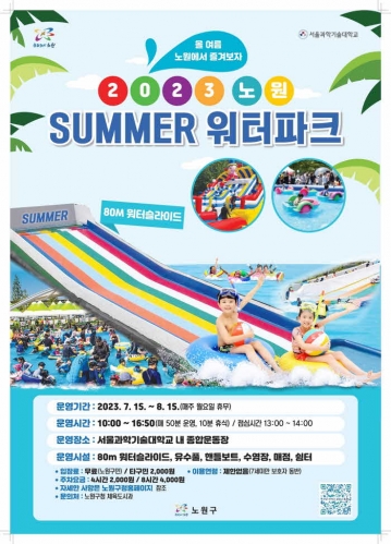 특히 주목할 것은 ‘노원 워터파크’이다. 서울과학기술대학교 운동장 9000㎡에 인조잔디를 깔고 야외수영장(3조), 물썰매장, 유수풀, 에어슬라이드(2조), 핸들보트(10대) 등을 구비했다. 물썰매장은 높이 8.5m, 길이 80m로 스릴을 즐길 수 있으며 수심별로 수영장을 갖춰 유아, 어린이, 청소년, 성인까지 다양한 연령층의 구민이 즐길 수 있다.