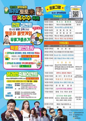 행사 기간 토토미 및 찰옥수수 판매와 함께 온라인 축제 이벤트인 ‘문막농협 쌀과 옥수수축제’로 11행시 짓기 콘테스트, 옥수수 축제 노래자랑, 청소년 댄스 치어리더 경연대회, 대형 가마솥 찐 옥수수 무료시식회, 인기가수 축하공연 등이 다채롭게 진행된다.