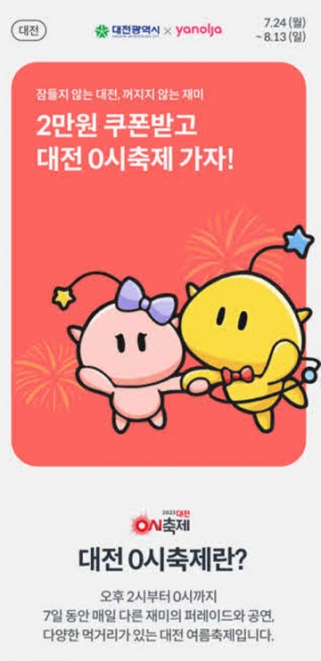 야놀자 앱 내‘대전 0시 축제 가자’숙박할인 기획전 페이지에서 대전지역 숙소 207여 개 대상 5만 원 이상 결제 시 2만 원 할인 혜택을 선착순으로 제공한다.