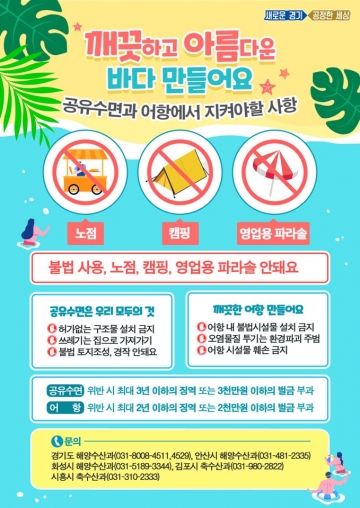 이에 경기도는 오는 29일부터 어린물고기의 포획 등 불법어업행위 단속을 시작으로, 화성·안산 등의 비지정 해수욕장에서 상습적으로 자행되고 있는 불법파라솔 및 불법시설에 대한 일제단속을 병행한다.