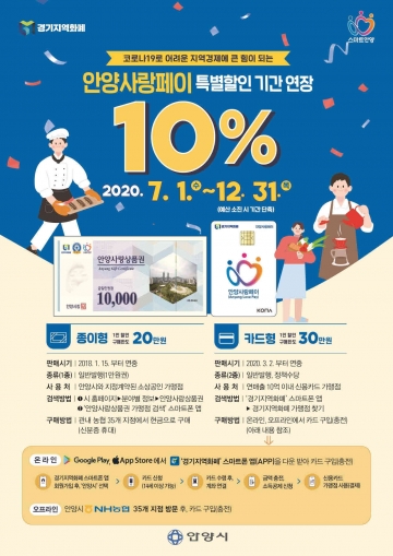안양시는 충전해 사용하는 카드형과 종이형 지역화폐인‘안양사랑페이’를 당초 6월에서 12월까지 10%할인판매 기간을 늘리기네