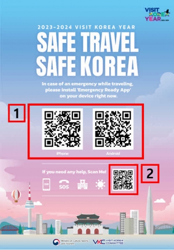 문화체육관광부(장관 박보균, 이하 문체부)는 (재)한국방문의해위원회(위원장 이부진, 이하 방문위), 에스케이(SK)텔레콤, 지에스(GS)리테일과 함께 ‘2023~2024 한국방문의해’를 맞이해 한국을 찾은 외래 관광객들이 안전하고 즐겁게 관광할 수 있도록 ‘안전한 대한민국 여행 정보’를 제공한다. 이를 위해 안전여행 관련 정보무늬(QR)를 담은 홍보물을 전국 주요 지에스(GS)25 편의점과 에스케이(SK)텔레콤 로밍부스를 통해 확산한다.