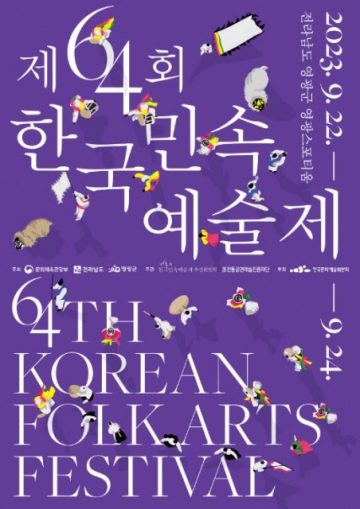 문화체육관광부(장관 박보균), 전라남도(도지사 김영록), 영광군(군수 강종만)이 주최하고 전통공연예술진흥재단(이사장 김삼진), 한국민속예술제 추진위원회(위원장 강등학)가 주관하는 ‘제64회 한국민속예술제’가 9월 22일(금)부터 24일(일)까지 3일간 전라남도 영광군 영광스포티움에서 개최된다.