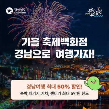 이번 2차 할인행사는 예산 소진 시까지 진행되며, 기존 여행상품당 최대 3만 원 할인에서 5만 원 할인으로 확대하고, 오색빛 가을색을 담은 경남 축제 여행패키지를 신규 출시해 추석 황금연휴와 가을을 즐기려는 관광객을 유인할 계획이다.