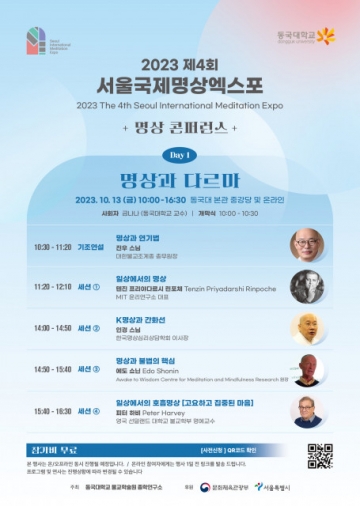 2023년 10월 5일 -- 10월 13일부터 22일까지 동국대학교 불교학술원 종학연구소가 주최하고, 문화체육관광부(이하 문체부)와 서울특별시(이하 서울시)가 후원하는 ‘제4회 서울국제명상엑스포’의 본격적인 행사가 개최된다. 올해로 4회째를 맞이하는 서울국제명상엑스포는 명상의 생활화와 대중화, 세계화를 위해 불교전통 기반의 명상을 토대로 K-명상 문화콘텐츠 프로그램 개발을 핵심 목표로 삼고 있다.