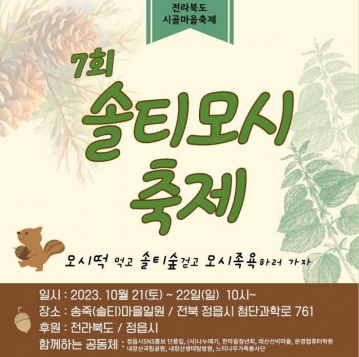 사라져가는 전통문화를 보존하고 마을 공동체를 회복하기 위한 제7회 솔티모시 축제가 10월 21일부터 22일까지 정읍시 솔티(송죽)마을 일원에서 개최된다.