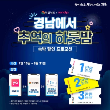 지난 6월 공모를 통해 국내 유명 온라인 여가 플랫폼 ‘㈜야놀자’를 프로모션 운영사로 선정함에 따라, 경남도는 야놀자 앱을 통한 ‘경남도 전용관 페이지’에서 숙박 예약과 결제 시 이용 가능한 할인쿠폰을 제공한다.