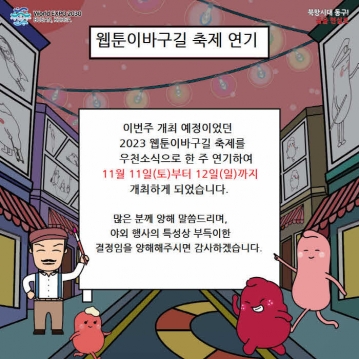 부산 동구(구청장 김진홍)는 오는 4일부터 5일 개최 예정이었던 ‘2023년 웹툰이바구길 축제’를 기상청 비 예보에 따라 한 주 연기하여, 11월 11일부터 12일까지 개최된다고 밝혔다.