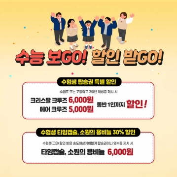 송도해상케이블카는 수능 수험생들을 위한 ‘수능 보GO! 할인 받GO!’이벤트를 11월 16일부터 12월 31일까지 진행한다. 수험생은 케이블카 할인은 물론 케이블카에서 가장 인기 있는 어트랙션 할인까지 다양한 할인 헤택을 받을 수 있다.