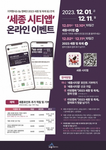 또한, ‘희망2024나눔 캠페인’과 연계해 세종 시티앱 포인트 5,000점 이상을 기부한 시민 300명의 이름으로 3,000점이 추가로 기부된다.