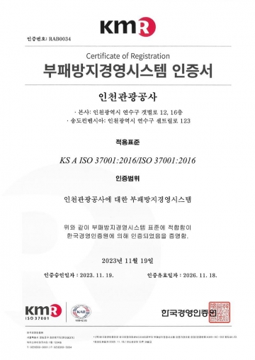 인천관광공사 백현 사장은 “부패방지, 안전보건, 인권경영시스템의 3가지 인증을 통해 시민들과 관광객들에게 지속가능하고 신뢰받는 공사가 되도록 더욱 더 최선을 다하겠다”고 말했다.
