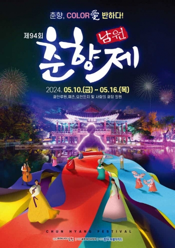 남원시(시장 최경식)는 제94회 남원춘향제를 오는 5월 10일(금)부터 5월 16일(목)까지 7일간 남원시 광한루원 일대에서 ‘춘향, Color愛 반하다’라는 주제하에 다채로운 콘텐츠와 프로그램으로 시민참여가 확대된 축제로 개최할 계획이라고 밝혔다.