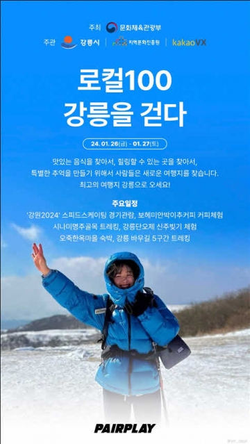 한편 이번 강릉편은 ‘로컬100, 00(지역명)을 걷다’의 시범사업으로, 지역문화진흥원은 카카오브이엑스(VX), ‘로컬100’ 지자체와 함께 지역별로 공식 상품을 출시해 내외국인 걷기 여행객에게 소개할 계획이다.