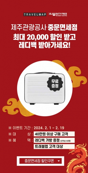 트래블맵과 제주관광공사는 프로모션 기간 중문면세점을 방문하는 모든 분들에게 최대 2만원의 면세품 할인쿠폰을 제공하는 한편, 방문 당일 40만원 이상 구매한 고객에게는 한정 수량으로 준비된 레디백을 선착순으로 증정할 계획이다.
