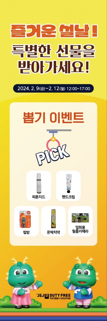 제주관광공사 중문면세점(이하 JTO중문면세점, 사장 고승철)은 오는 2월 9일부터 12일까지 제주 방문 여행객과 도민을 대상으로 ‘추억의 뽑기 이벤트’를 실시한다고 6일 밝혔다.