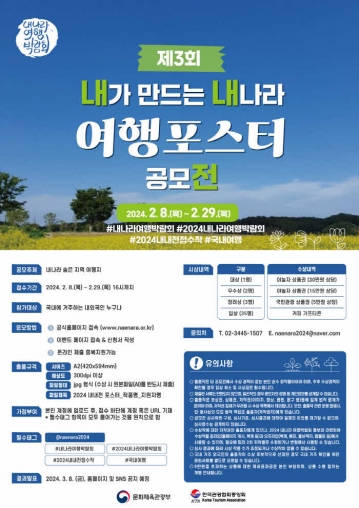 한국관광협회중앙회(회장 윤영호, 이하 중앙회)는 오는 3월 28일(목)부터 3월 31일(일)까지 개최 예정인 ‘2024 내나라 여행박람회’의 일환으로 공모전을 진행한다고 밝혔다.