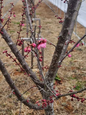 강진군이 강진청자축제를 위해 식재한 봄꽃 홍매화가 꽃망울을 터트리며 관광객들을 설레게 하고 있다.
