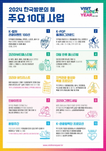 문화체육관광부(장관 유인촌, 이하 문체부)는 한국관광공사(사장직무대리 서영충, 이하 관광공사), (재)한국방문의해위원회(위원장 이부진, 이하 방문위)와 함께 ‘2024 한국방문의 해’ 주요 10대 사업을 통해 색다른 케이-컬처를 체험하고 지역에서 즐기는 한국 관광을 선보인다.