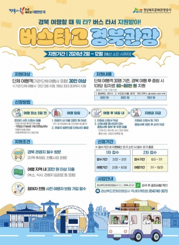 경상북도와 경북문화관광공사(이하 공사)는 2024년 ‘버스타고 경북관광’ 사업을 2월 22일부터 시행한다고 밝혔다.