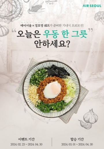 에어서울(대표이사 조진만)이 일식 전문 셰프 정호영의 ‘우동 기내식’ 구매 고객 대상 프로모션을 시작한다고 밝혔다.