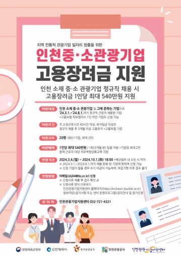 인천광역시(시장 유정복)와 인천관광공사(사장 백현)는 인천 중소 규모 전통적 관광기업의 원활한 인력수급 및 안정적 운영을 지원하는 ‘2024 인천 중·소 관광기업 고용지원 사업’을 진행한다고 밝혔다.