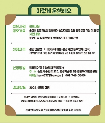 시 관계자는 “순천시 지역특화 우수관광상품 지원사업을 통해 지역기업과 연계된 순천다움을 담은 특화된 관광상품이 다양하게 개발되기를 기대한다”고 전했다.