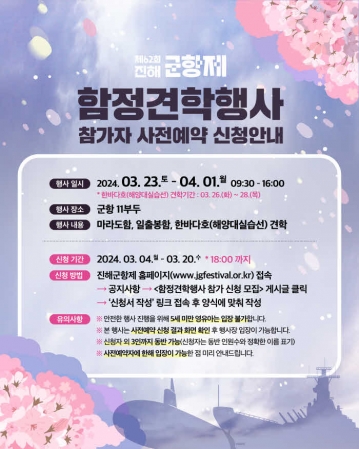 제62회 진해군항제 주관단체인 이충무공선양군항제위원회(이하‘선양회’)는 3월 4일부터 3월 20일까지 제62회 진해군항제 ‘함정견학행사’의 사전 예약 신청을 접수한다고 밝혔다.