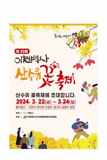 겨우내 움츠러들었던 사람들의 몸과 마음을 깨우고 힘찬 봄의 시작을 함께 할 이천백사산수유꽃축제가 3월 22일부터 3월 24일까지 3일간 백사면 경사리, 도립리, 송말리 일대에서 개최된다.