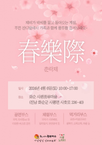 화순 사평풍류마을은 다음달 6일 오전 10시부터 오후 5시까지 화순군 사평면 사호로 236-40 일원에서 마을 봄축제인 ‘삼짇날 풍류즐기기-춘락제’를 진행한다고 밝혔다.