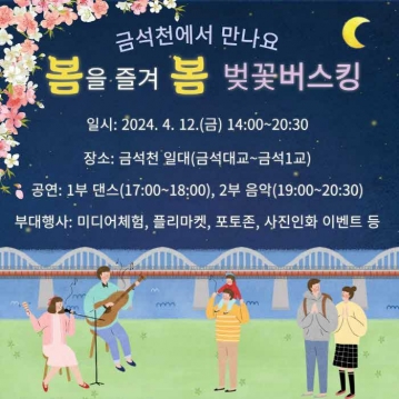 ‘봄을 즐겨 봄’ 행사는 관내 금석천 일대를 중심으로 미디어체험과 플리마켓이 열리고, 벚꽃 포토존과 LED 경관 조명 설치, 시민참여 SNS 이벤트 등 봄의 정취를 만끽할 수 있는 부대행사가 꾸며질 계획이다.