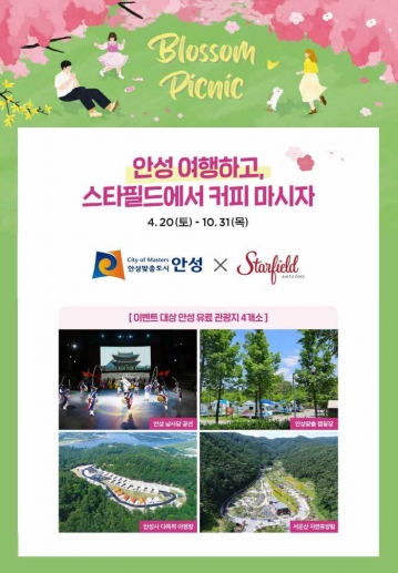 이번 이벤트는 안성의 유료 관광지(4개소)를 이용하면 스타필드 안성점에서 카페이용권(5천원권)을 제공하는 것으로 오는 4월 20일부터 10월말까지 진행한다고 밝혔다.