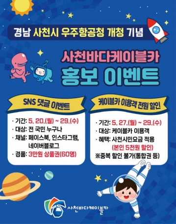 사천시시설관리공단은 사천시 우주항공청 개청을 기념하고 사천바다케이블카 인지도 향상을 위해 이벤트 행사를 실시한다고 밝혔다.