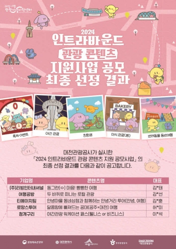 대전관광공사(사장 윤성국)는‘2024 인트라바운드 관광 콘텐츠 지원 공모사업’을 통해 총 5개의 관광 콘텐츠를 최종 선정했다고 16일 밝혔다.