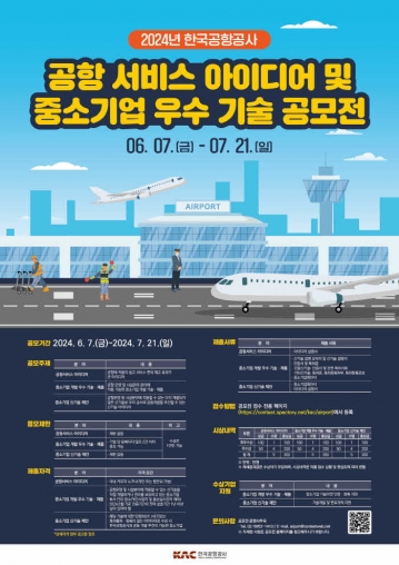 한국공항공사(사장직무대행 이정기)는 공항서비스를 개선하고 공항운영·시설분야 중소기업의 성장을 지원하기 위해 '공항서비스 아이디어 및 중소기업 우수 기술 공모전'을 개최한다.