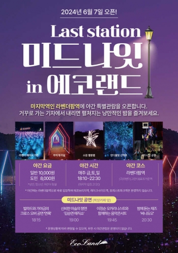 ‘미드나잇 인 에코랜드’라는 타이틀로 진행되는 이번 야간개장은 연인들의 사랑을 주제로 하며, 라벤더 팜 역 주변에서 진행된다. 6시부터 입장할 수 있는 야간개장은 거꾸로 가는 기차를 타고 라벤더 팜 역으로 여행을 떠나며 시작된다. 라벤더 팜 역에 도착해 공방을 지나면 라벤더와 버네나, 수레국화가 만개한 만여 평의 정원이 펼쳐진다.