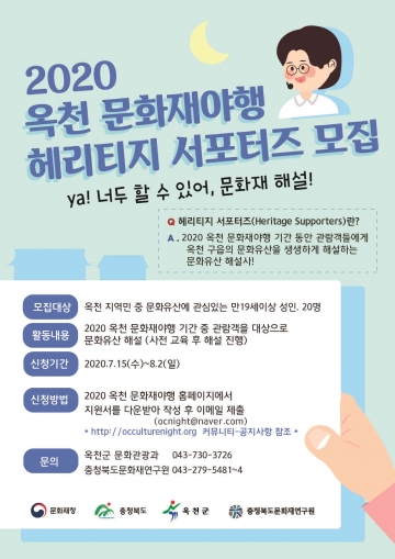 옥천군은 오는 8월2일까지 옥천 문화재 야행(9월 4일~5일)을 위해‘헤리티지 서포터즈’(문화유산해설사) 1기 20명을 모집한다.