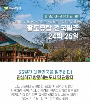 승우여행사의 전국일주 ‘팔도유람 24박25일’ 여행은 전문가이드가 동행해 전용 차량으로 이동하며, 이동 항공료와 선박료, 일정상의 숙소, 식사, 관광지 입장료 등 필수 포함사항을 모두 포함해 1인 795만원에 판매된다. 올해는 10월 1일 단 1회만 출발 예정이며, 조기 마감돼 대기 예약만 가능하다. 2025년에는 4월과 10월에 출발 예정이다.