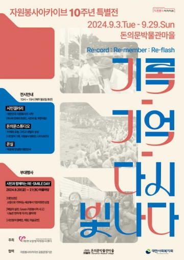 서울시 돈의문박물관마을(시장 오세훈)에서 9월 3일부터 29일까지 (재)한국중앙자원봉사센터가 주최하는 자원봉사 아카이브 10주년 특별전 《기록-기억-다시 빛나다》展이 열린다. 이번 전시는 시민갤러리 1관과 2관, 온실, 그리고 돈의문 스튜디오에서 진행되며, 한국 자원봉사의 역사적 기록과 기억을 담아낸다.