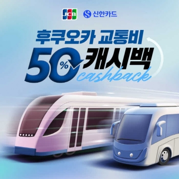 오는 10월 31일까지 후쿠오카에서 JCB 컨택리스가 탑재된 신한카드로 교통 터치 결제 시 결제 금액의 50%가 캐시백된다. 카드당 최대 2000엔까지 받을 수 있다.