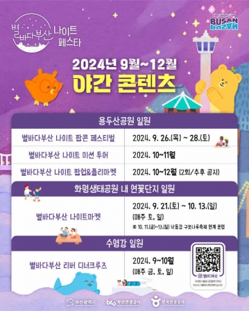 또한 올해 첫선을 보이는 ‘별바다부산 나이트 팝콘 페스티벌’은 9월 26일(목)부터 3일간 용두산공원에서 열린다. ‘2024 별바다부산 나이트 팝콘 페스티벌’은 부산 야경의 다채로운 색상을 콘셉트화한 인기 아티스트 공연 및 사일런트 시스템을 활용, 다양한 장르의 음악을 감상할 수 있는 △음악감상존 △체험 △먹거리 △플리마켓존 등으로 구성해 용두산공원 일대는 감성 있는 야간 축제의 장으로 변신할 예정이다.