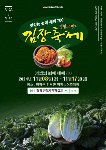 2024 평창고랭지김장축제(http://www.gimjang700.co.kr)가 오는 11월 8일부터 17일까지 강원도 평창군 진부면에 위치한 평창송어축제장에서 열린다. 평창고랭지축제위원회(위원장 최기성, 이하 축제위원회)가 주최하고, 평창군·평창군의회·진부면 사회단체가 후원한다.