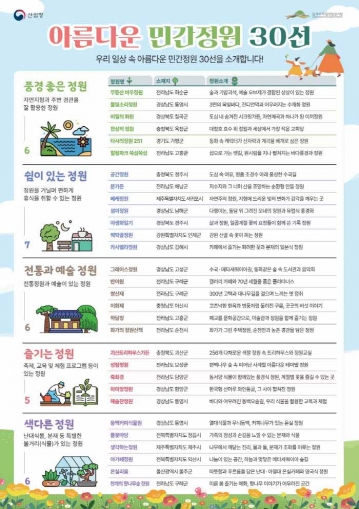 산림청(청장 임상섭)은 대국민 온라인 선호도 조사와 전문가의 현장 심사를 거쳐 ‘아름다운 민간정원 30선’을 선정했다고 24일 밝혔다. ‘민간정원’은 법인, 단체 또는 개인이 정성을 다해 가꾸어 국민이 함께 즐길 수 있도록 개방한 정원으로, 현재 전국에 150여 개소가 운영되고 있다.
