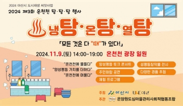 아산시가 오는 9일 온천천 광장(아산시 번영로86번길 27-4) 일대에서 온양온천의 정체성이 담긴 특화축제인 ‘제3회 온천천 탕·탕·탕’을 개최한다.